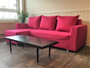 Below - the sofa in vibrant modern mood. The covers are in the plain style, no piping no kick splits. In this style, the bottom hem can be extended under the base of the sofa for a few cm, as here, and pulled taut with a drawstring to give a neat fit. The fabric is one from our fabric selection, Turin plain weave in colour Fuchsia.